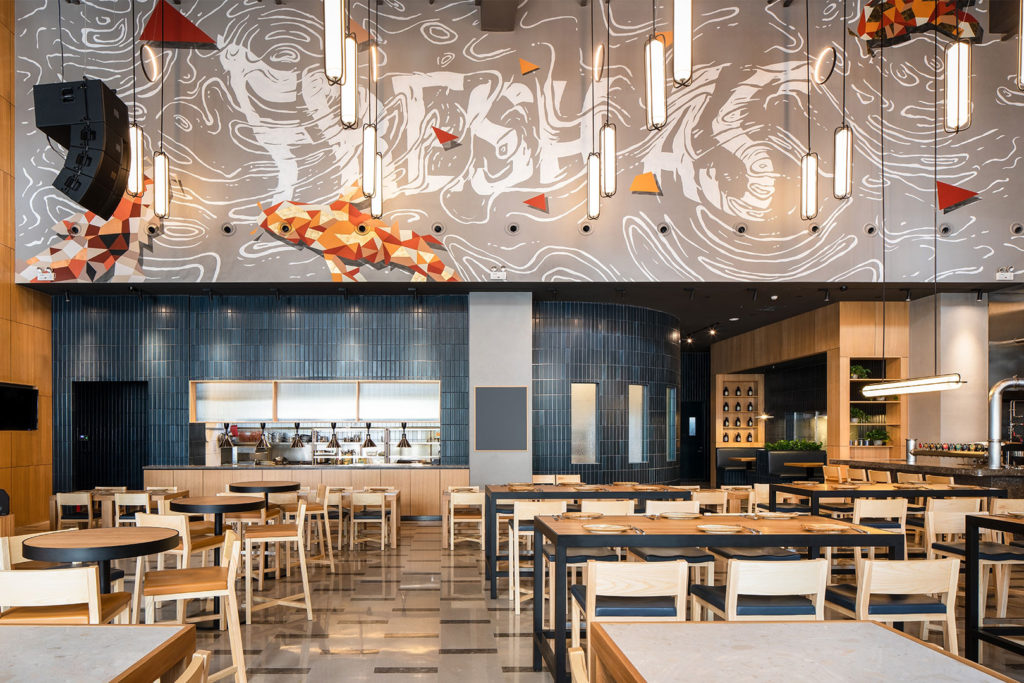 Oh Yeah! has several bold signage placements: on the front of the building, within the seating area, and across the steel entrance.