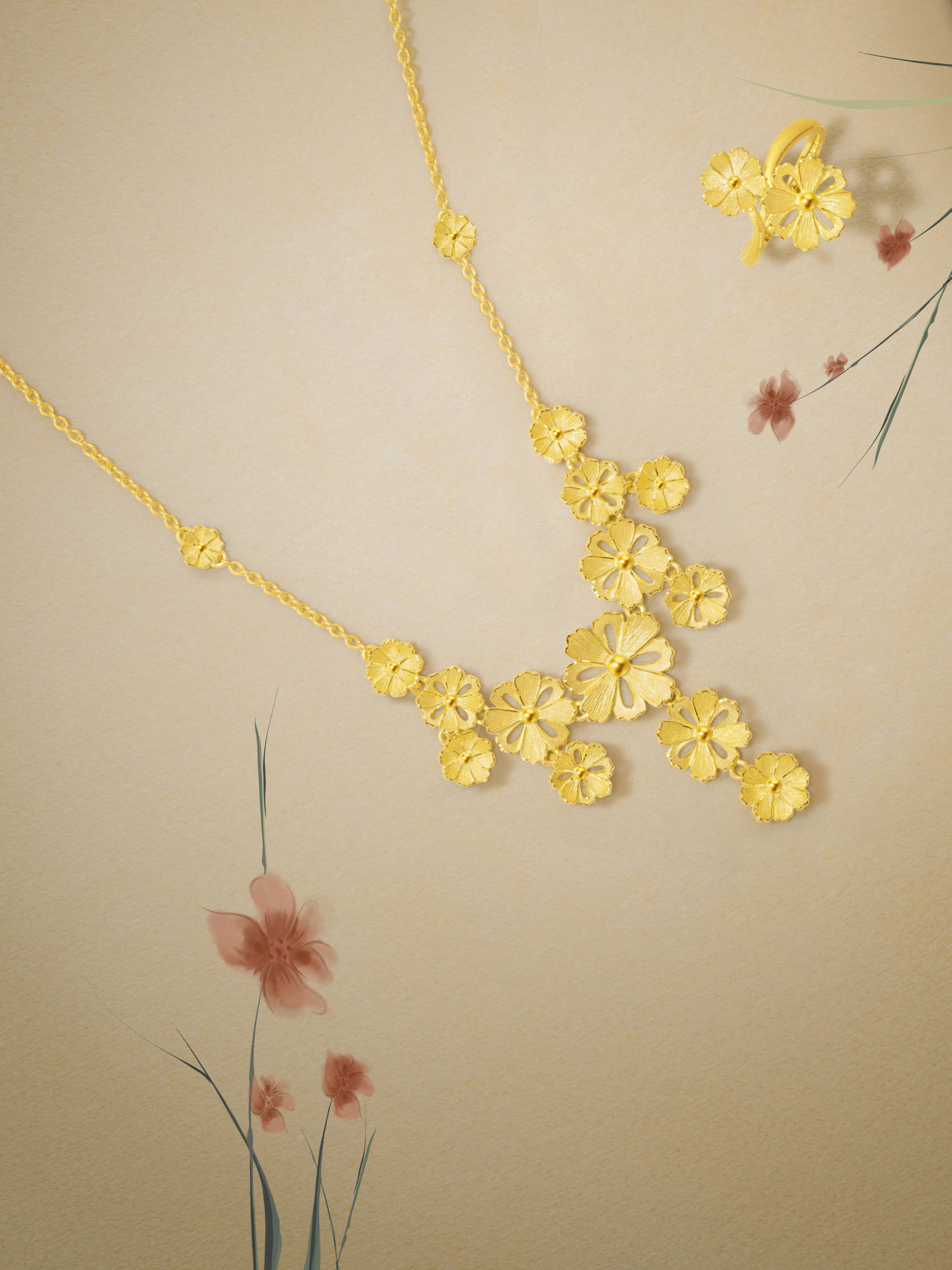 “土” (earth) embodies nurturing and integration, corresponding to the element “花” (flowers). Considering earth as a nurturing force for plants and flowers, in this series, we drew further inspiration from the Chow Sang Sang Floral Charm collection, particularly the design inspired by Gesang flowers. We incorporated floral depictions with contemporary strokes delicately and elegantly.
