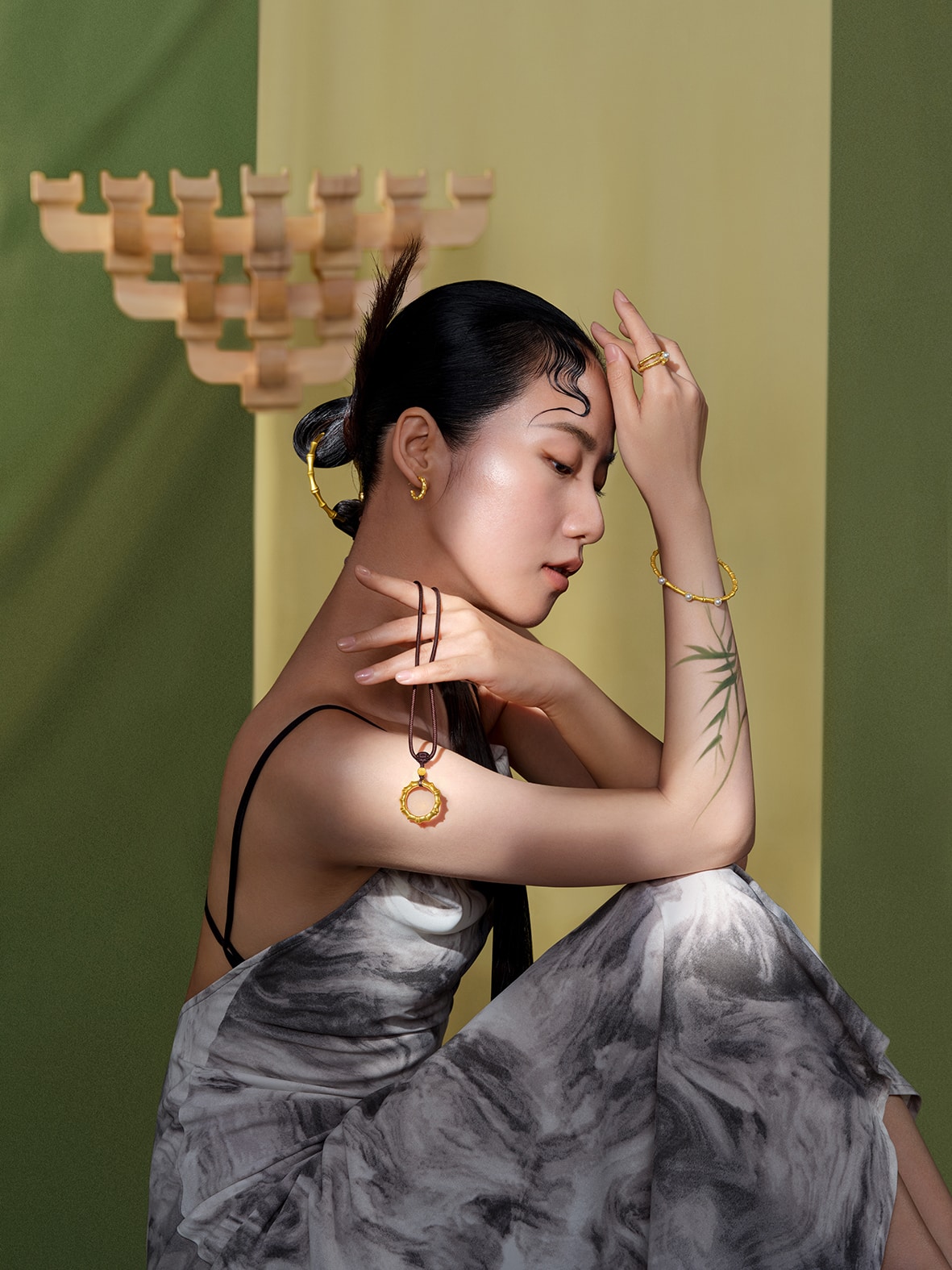 “木” (wood) represents growth, corresponding to the idea of “树枝” (branches) that reach upward. Wood holds a special place in Chinese classicism. Taking “竹” (bamboo) as one of the ‘four noble ones,’ a collective term for four plants in Chinese art, we leveraged its symbolism of flexibility and strength. Also, its enduring green color signifies growth, vitality, and longevity. Similarly, Chow Sang Sang’s bamboo-shaped series perfectly embodies the vitality of “木” (wood).