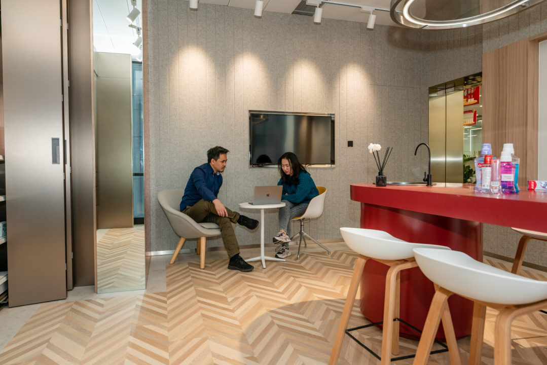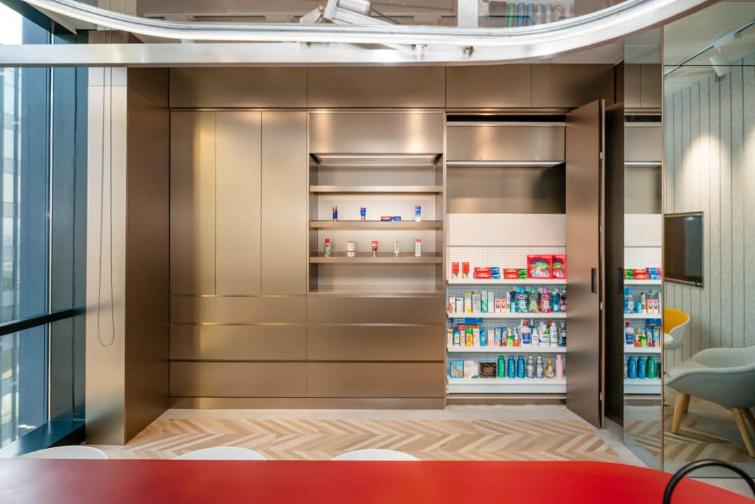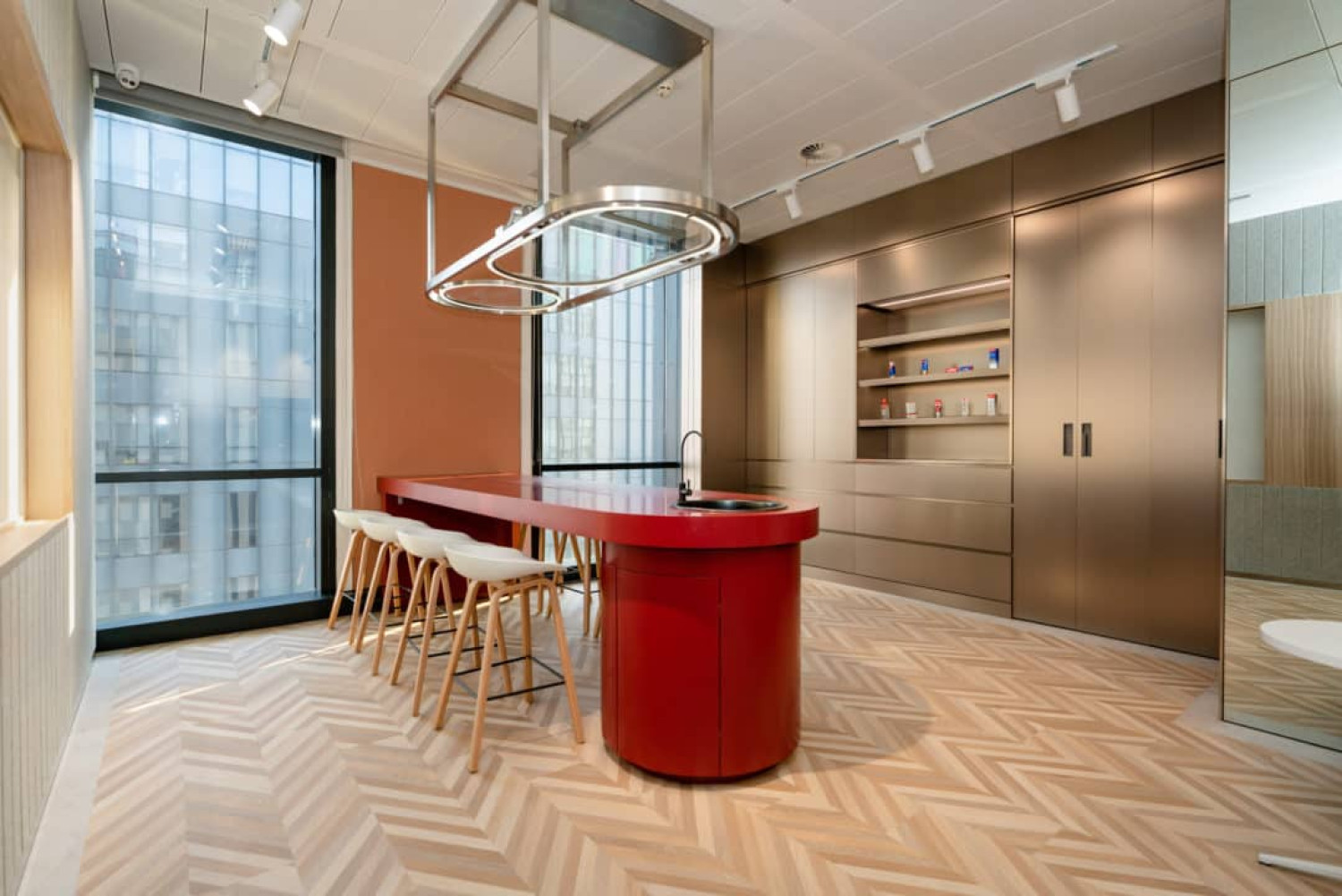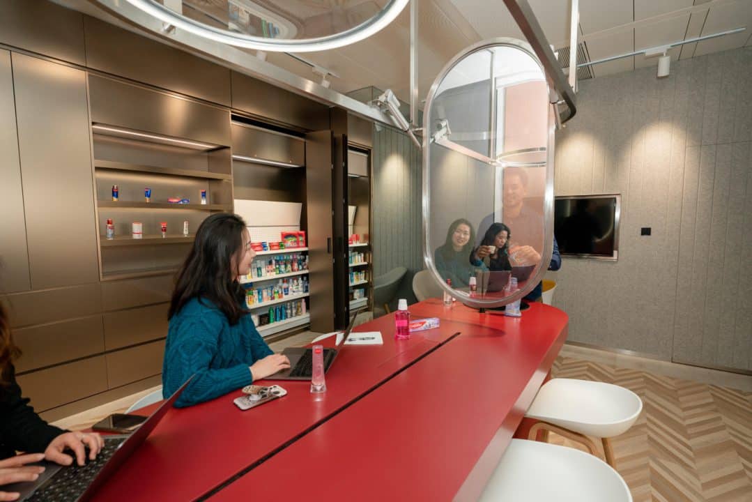 The red center island is the brand colour of Colgate-Palmolive and the hero product of the room. When users need the room for roundtables and official meetings, they sit around the island on highchairs. However, at the end of the island center, is a tap and basin, custom-designed to allow consumers to test products.