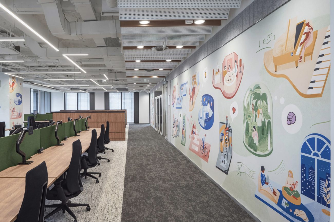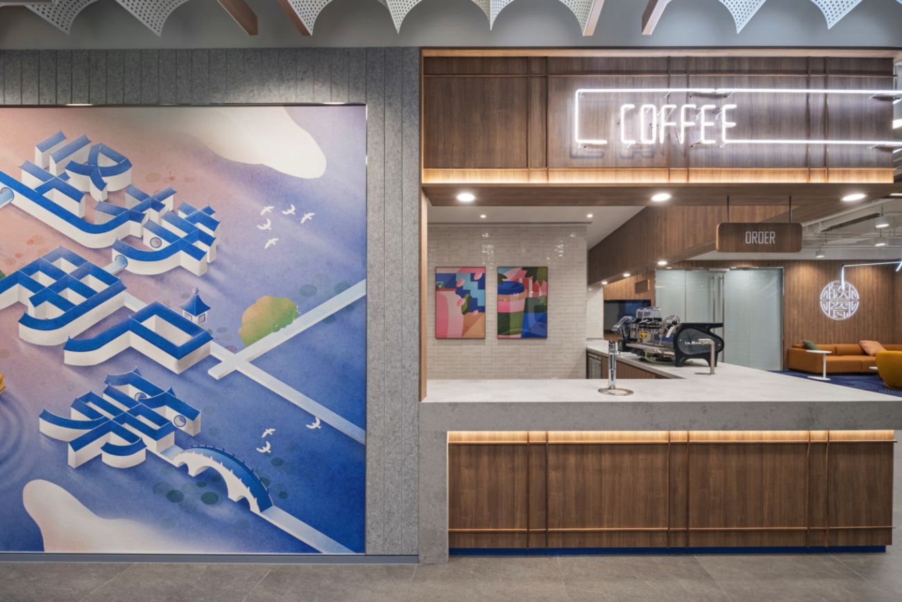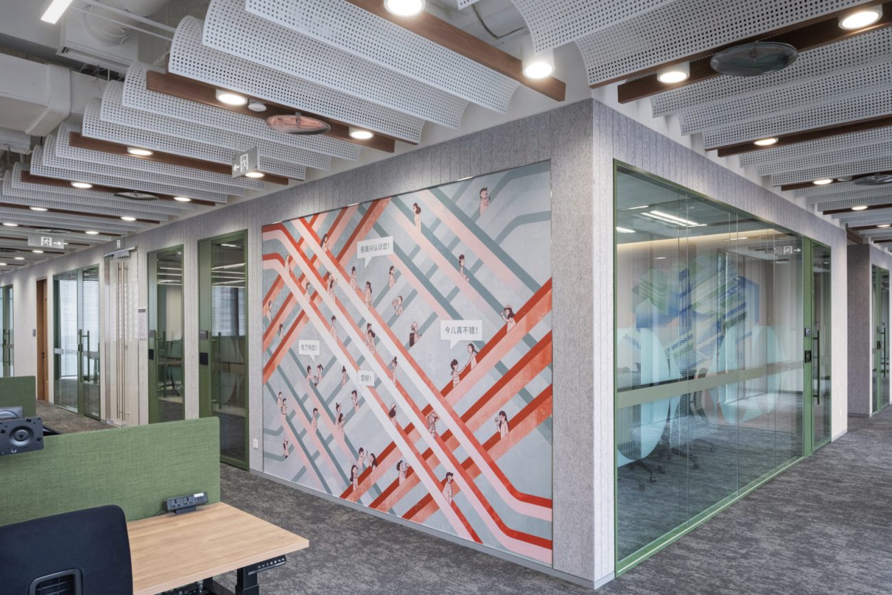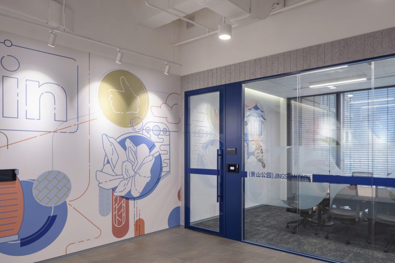 Like LinkedIn, Beijingers are spread out all over the city, but people always find a way to stay connected. On walls of the seventh floor, the story shows a busy city with many people from different backgrounds finding reason and value to connect and collaborate.