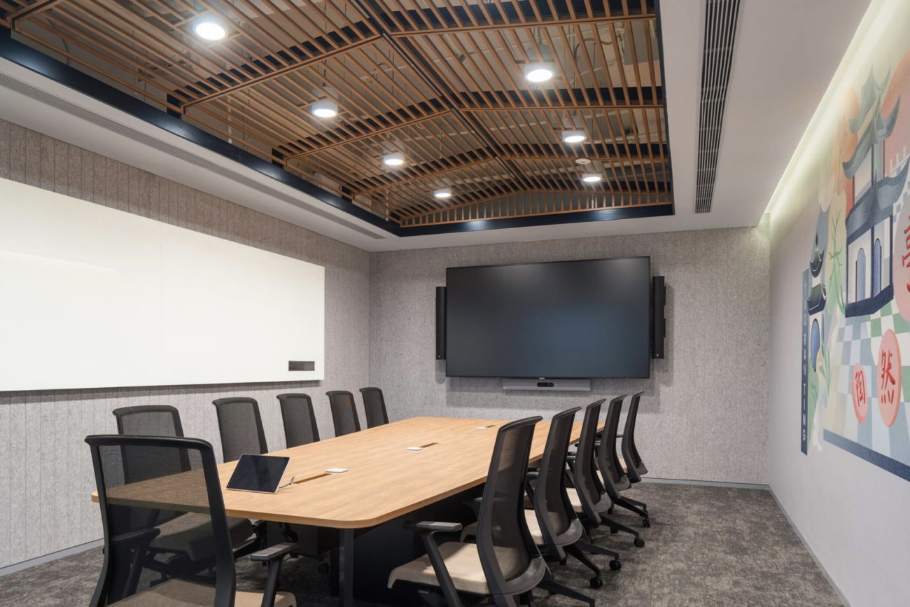 We integrated design elements that would bring the Chinese culture and global community together. For example, in the waiting area to the left of the reception, guests will notice that on the ceilings are wooden Chinese characters “人“ (meaning “people”) made out of a metal structure with LED neon strips. The two circles hung on the wall, are window-like in shape, found in the park pavilions made from local Beijing sayings such as “大拿” (meaning “the professionals in the industry”) and “铁瓷” (meaning “very good friends”).