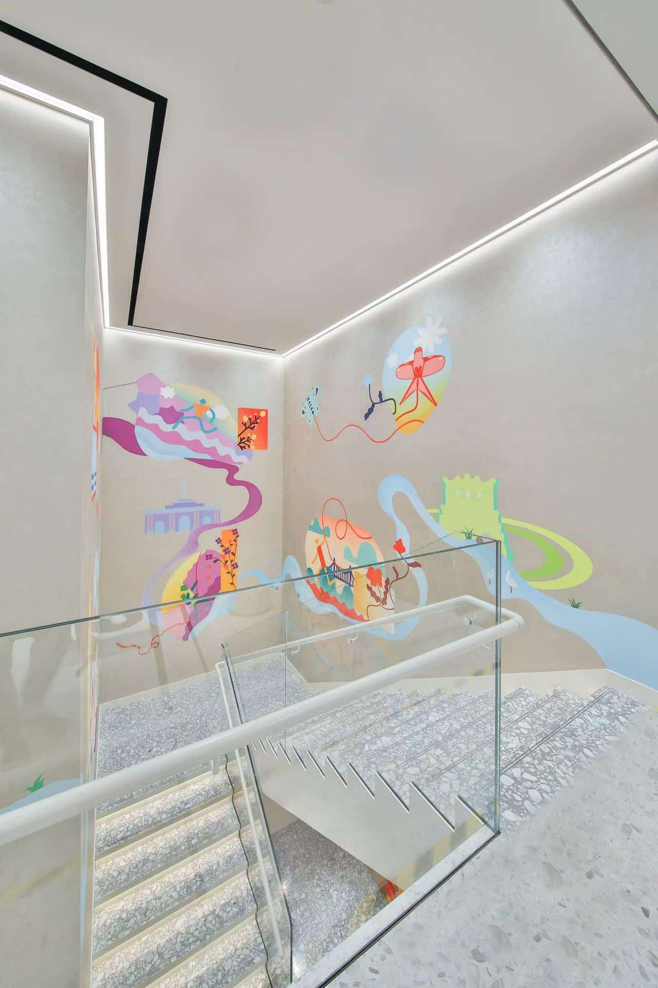 Each direction became an abstract “island” in the art design. We designed a visual story that is self-contained yet interconnected scenes visualising a moment, a mood, or a movement. These islands were linked by stylised river lines representing the Yangtze and Qinhuai, creating a visual spine across the five walls.