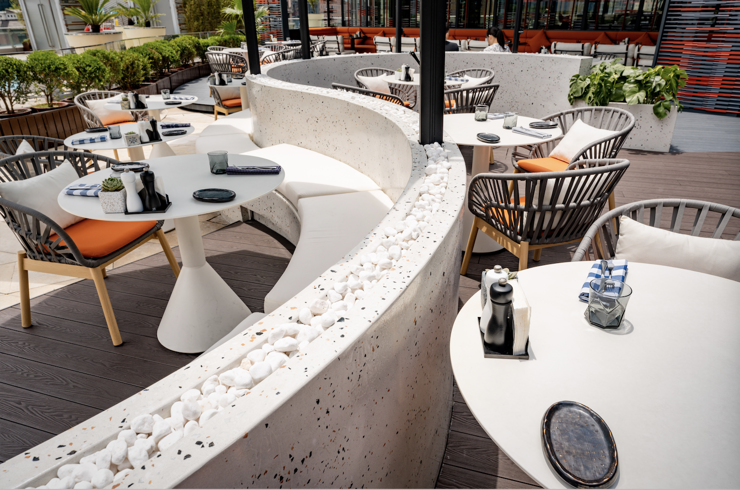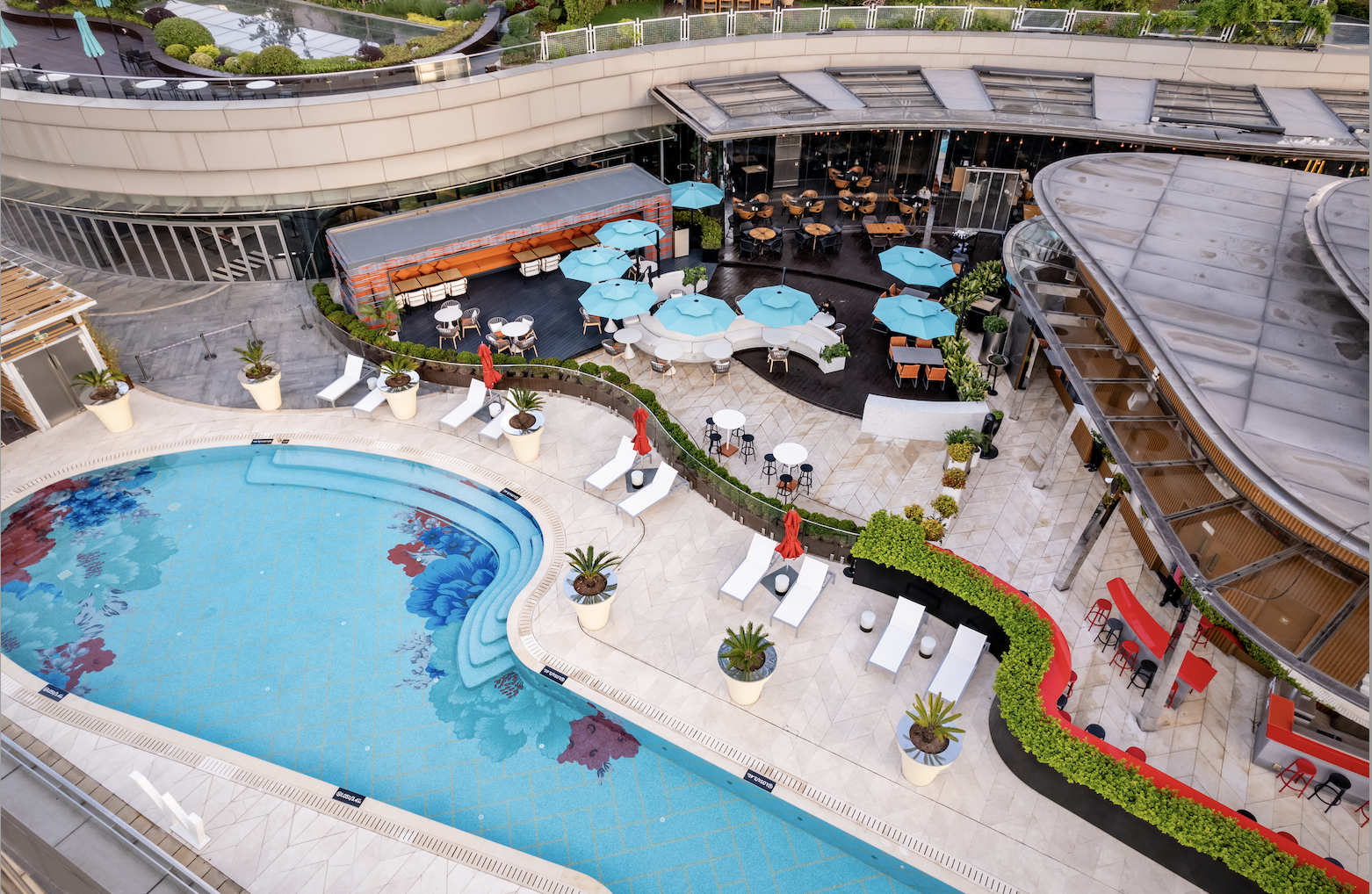 We created more floor space for dining tables that enabled the ease of patrons and staff moving around the space. A communal dining area surrounding the pool not only serves as a feature but also a photo opportunity for customers. We created a lively and vibrant atmosphere that brings the terrace to life. Lounge dining pockets were added to the design to create a sense of exclusivity and privacy for larger groups while also giving a lifestyle vibe. The result elevated the overall experience of the guests.