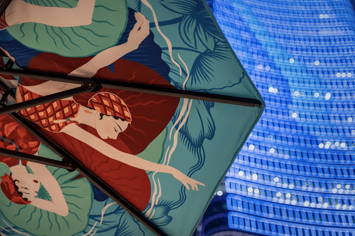 You’ve got to admit the W Shanghai Terrace has a stunning view that you could look at for hours, even in the sweltering heat. But hey, who wants to be sunburnt when admiring the lovely view? To help create a comfortable environment for patrons, we designed visually striking umbrellas, which incorporated Chinese and tropical elements to evoke a sense of fun and relaxation. The illustration features synchronized swim girls wearing swimsuits styled after the traditional Qi-Pao dress, with their hair adorned with flowers. The background of the illustration is filled with lily pads and giant flowers in bright red colors, accented with small blue details. By incorporating these vibrant and playful elements, we aimed to create an umbrella design that is not only functional but also adds to the overall aesthetic appeal of the space.